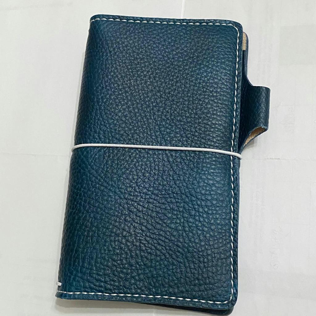 Cascade Design: Features vertical cascading pockets on the inner left-hand side, interior elastics for holding traveler's notebook style inserts, and a secretarial pocket on the right-hand side with a built in pen loop. All wrapped closed with an elastic on the spine.